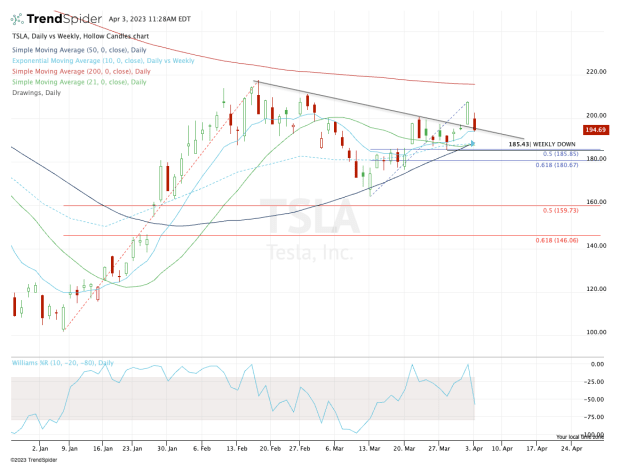 Tesla (TSLA) shares exploded in the first quarter, rising 69%. But for the longs, the shares of the Austin electric-vehicle group are starting off Q2 on the wrong foot, down about 5.5% at last glance.