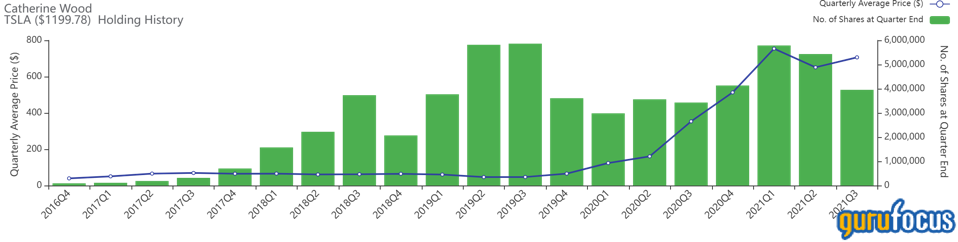 story As of the end of the third quarter, Woods’s five largest holdings, accounting for over half of the equity portfolio, were Tesla Inc.
