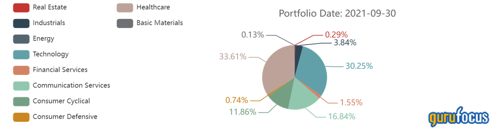 The guru’s $41.63 billion equity portfolio consisted of 43 stocks as of Sept. 30. A majority of the portfolio was invested in health care stocks at 33.61%, while the technology sector has a weight of 30.25% and the communication services space represents 16.84%.