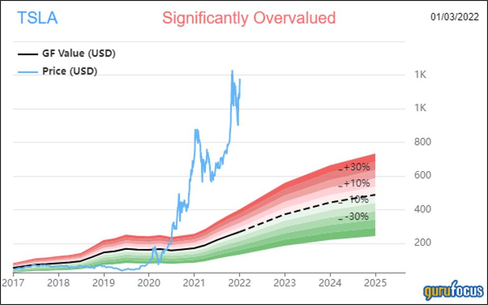 The well-known electric vehicle manufacturer has a $1.17 trillion market cap; its shares were trading around $1,161.16 on Monday with a price-earnings ratio of 377.47, a price-book ratio of 43.3 and a price-sales ratio of 28.16.