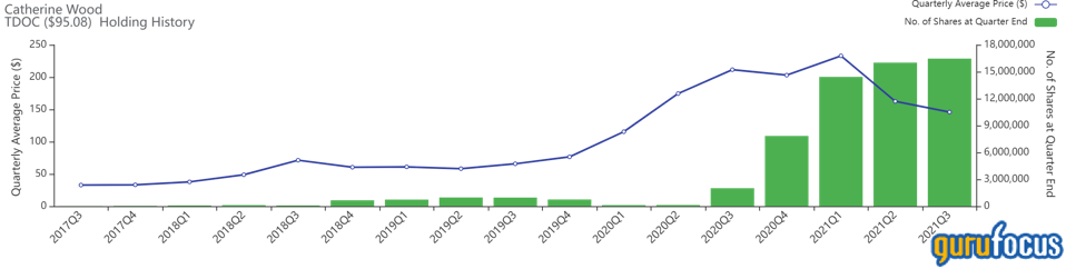 With a 10.28% stake, Wood is Teladoc’s largest guru shareholder. Baillie Gifford (Trades, Portfolio), Ray Dalio (Trades, Portfolio) and Mario Gabelli (Trades, Portfolio) also own the stock.