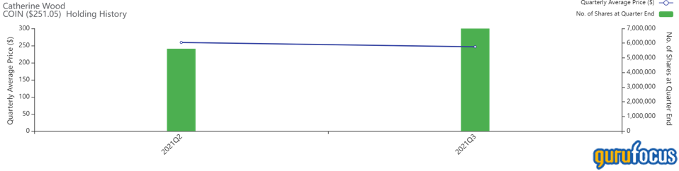 With 3.82% space in the equity portfolio, Coinbase Global (COIN, Financial) is the guru’s third-largest stake. GuruFocus data shows Wood has lost an estimated 1.39% on the investment since establishing it in the second quarter of 2021.