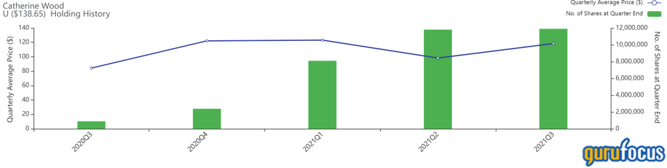 With a weight of 3.61%, Unity Software (U, Financial) is the fourth-largest position in Wood’s equity portfolio. GuruFocus data shows she has gained approximately 22.13% on the investment.