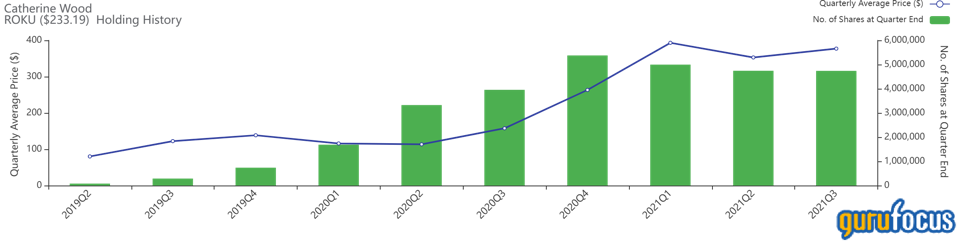 As with most of her other top holdings, Wood is Roku’s largest guru shareholder with a 3.53% stake. Baillie Gifford (Trades, Portfolio), Cohen, Jim Simons (Trades, Portfolio)’ Renaissance Technologies, Jones, Greenblatt and Lee Ainslie (Trades, Portfolio) also own the stock.