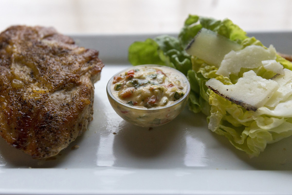 It caught my eye for several reasons. First, I am always on the look out for chicken recipes with interesting twists or pairings. Secondly, it had an interesting vinaigrette, described as "chunky" that uses a blend of piquillo peppers, capers and soft-boiled eggs. It's really less of a vinaigrette and more of a topping for the chicken and lettuce. Lastly, it gave me a chance to splurge on some Manchego cheese, Spain's most well-known cheese hailing from La Mancha. The cheese is shaved and served on top of the lettuce. On a trip to Spain several years ago, we enjoyed the cheese many, many times. We ate it on appetizers and stuffed in piquillo peppers.
