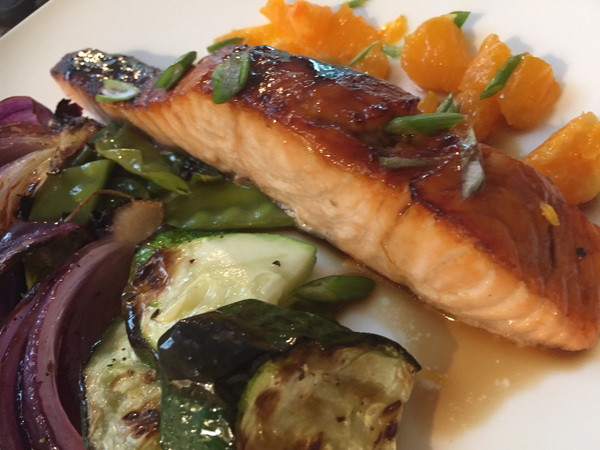 I thought about ingredients that can stand on their own and needed no help. I was reminded of things that many chefs tout: source quality ingredients; treat ingredients simply; and season, but don't over season. And when it came to seasoning, I turned to using ingredients that could do double duty. In today's Soy-Glazed Salmon, the soy sauce rendered the use of salt and pepper seasoning on the salmon unnecessary. And roasting vegetables brings out their natural sugars so they are good on their own.
