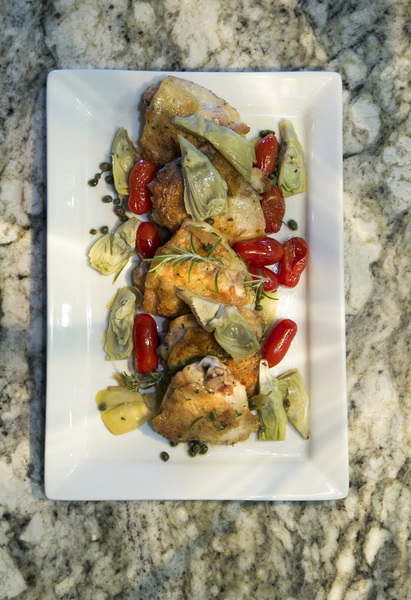 What also makes this dish interesting is pairing the chicken with artichokes, cherry tomatoes and caperberries. Recently at a farmers market there was no shortage of some mighty fine heirloom cherry tomatoes that were deliciously sweet. While capers are a staple in my pantry, caperberries are not. And they're not the same thing, anyway.