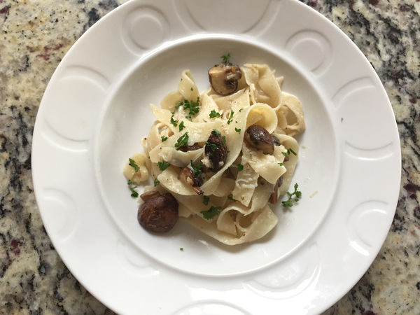 Love upped the ante of a traditional Cacio e Pepe with the addition of roasted maitake (also called hen of the woods) mushrooms. Maitake is a specialty mushroom, and I couldn't find any in my neck of the woods. For today's dish, I quartered and roasted cremini mushrooms. Roasting the mushrooms deepens their heartier flavor. The key with roasting them is not to overcrowd them on the baking sheet, as Love suggested, or they will become soggy.