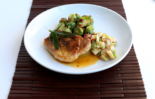 This pork dish pairs nicely with a side of pan-sauteed Brussels sprouts. To prepare them, trim their ends and remove any wilted, yellowish leaves. Cut up (use scissors because it's super easy) 4 slices of bacon and add them to a skillet. When the bacon is crisp, cut the Brussels sprouts in half (or leave them whole) and add them to the skillet. Saute the Brussels sprouts until crisp-tender.
