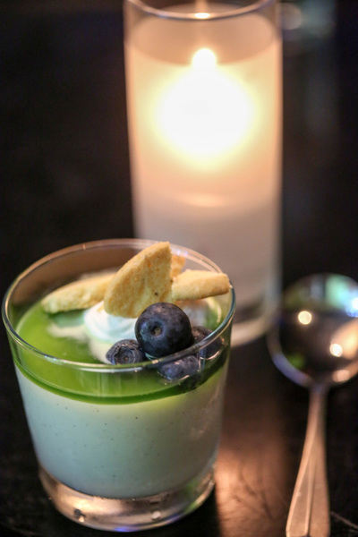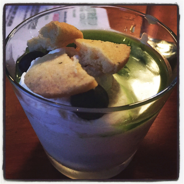 But it wasn't just any vanilla pudding. This ultra-creamy pudding was topped with a dollop of bourbon-spiked whipped cream and pieces of crisp, buttery rosemary shortbread cookie. But the true highlight of the dessert was hidden underneath the cookie crumbles and whipped cream: a pool of chartreuse-hued syrup. Sweet but with a herbacious side, the syrup was scented with basil and tasted simply divine.