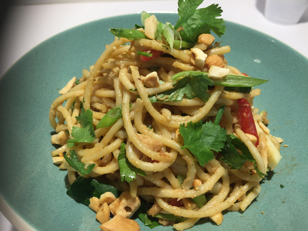 Spicy, gingery and easy, this noodle dish is versatile and requires only a few pantry ingredients. You can use any kind of chicken and pasta. With minimal prep work, you can whip this dish up faster than picking up the phone and ordering take-out. And, barring any peanut allergies, kids should like it, too. This works as a main or side dish. It's also terrific cold.