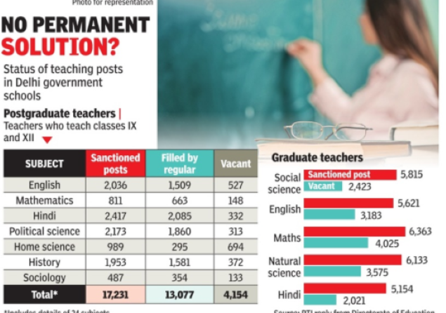 NEW DELHI: Despite conducting tests to recruit teachers, Delhi government has not been able to fill all the vacant posts in its schools. There are vacancies for both regular graduate and postgraduate teachers. Schools are making do with guest teachers filling in for regular teachers who are yet to be appointed.
