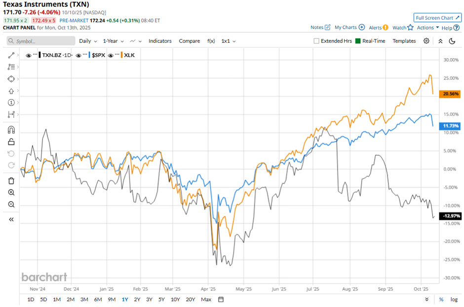 Shares of Texas Instruments have decreased nearly 16% over the past 52 weeks, lagging behind the broader S&P 500 Index's ($SPX) 13.4% gain and the Technology Select Sector SPDR Fund's (XLK) 23.3% increase over the same period.