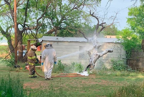 The hive was located inside a tree and firefighters killed the bees by spraying foam onto them, authorities said.