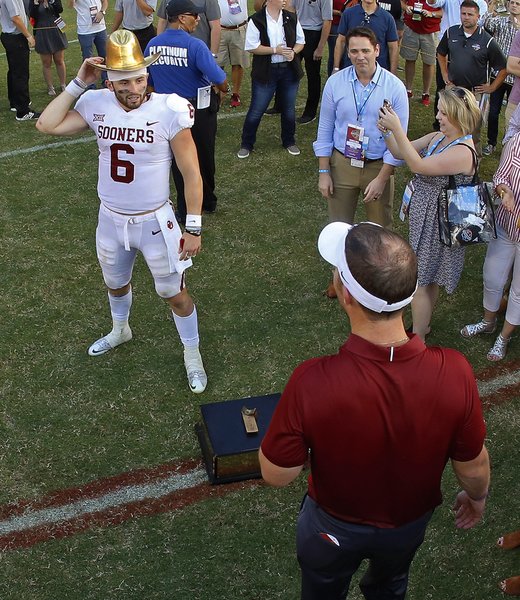 Mayfield will finish his collegiate career with a 2-2 mark against the hometown team that never offered him a scholarship. OU's Ogbonnia Okoronkwo, not Mayfield, played the Sooners' flag at midfield, right smack in the middle of the Cotton Bowl logo.
