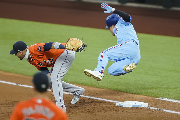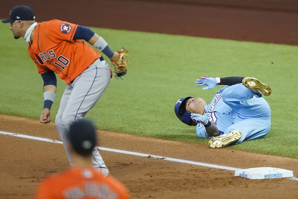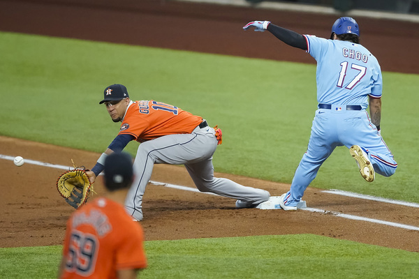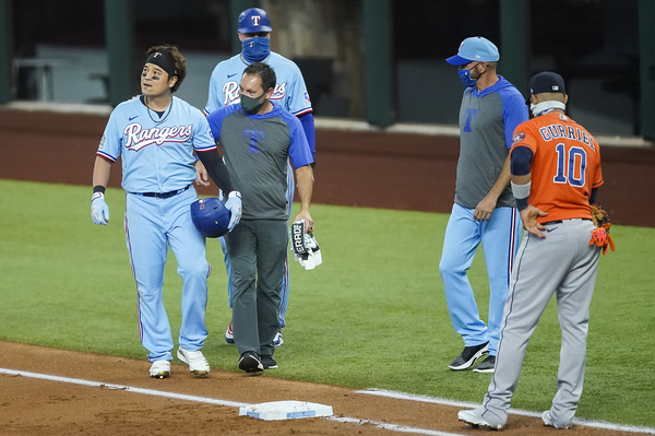 Texas Rangers designated hitter Shin-Soo Choo is checked on after he tumbled over the bag while beating the throw to Houston Astros first baseman Yuli Gurriel for a lead-off bunt single during the first inning on Sunday, September 27, 2020 at Globe Life Field in Arlington, Texas. Choo was activated from the 10-day Injured List before the season finale, but was injured on the play and left the game. (Smiley N. Pool/The Dallas Morning News/TNS)
