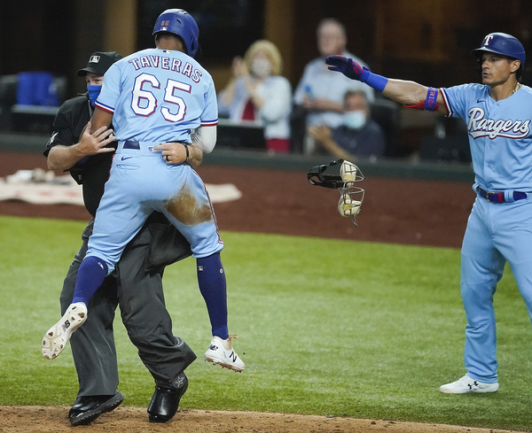 He capped the Rangers' five-run fourth with a two-run single, and raced around the bases for a run in the seventh. Taveras dropped a bunt for a leadoff single, and on consecutive pitches stole second and third. The throw to get him at third went into left field, and he jogged home.