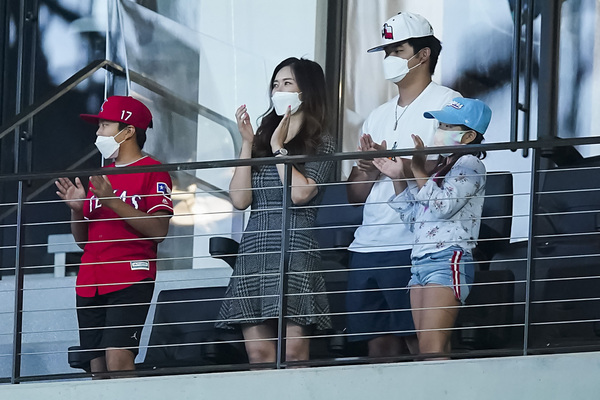The family of Shin-Soo Choo, from left Aiden, Won Mi Ha, Allan and Abigail, applaud a video tribute to the Texas Rangers outfielder following the first inning against the Houston Astros on Sunday, September 27, 2020 at Globe Life Field in Arlington, Texas. Choo was activated from the from the 10-day Injured List before the season finale and singled on a lead off bunt in the first inning, but left the game after being injured on the play. (Smiley N. Pool/The Dallas Morning News/TNS)