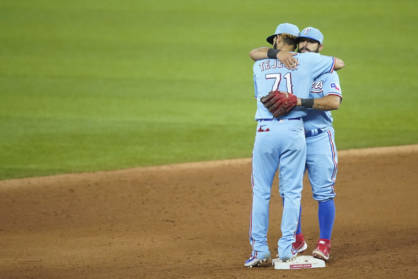 Texas Rangers second baseman Rougned Odor hugs shortstop Anderson Tejeda after an 8-4 win over the Houston Astros in the Rangers' season finale on Sunday, September 27, 2020 at Globe Life Field in Arlington, Texas. (Smiley N. Pool/The Dallas Morning News/TNS)