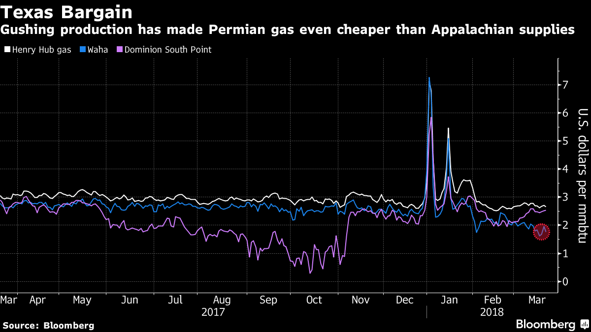 A pipeline shortage that’s leaving gas trapped in West Texas’ Permian Basin means prices for the fuel there are the lowest of any major U.S. hub, wresting that distinction from Appalachia’s Marcellus Shale. Prices for Permian gas, produced alongside oil in the play, have tumbled 32 percent from a year ago, while output rose to a record. And the pipeline crunch is also pummeling the region’s oil market.
