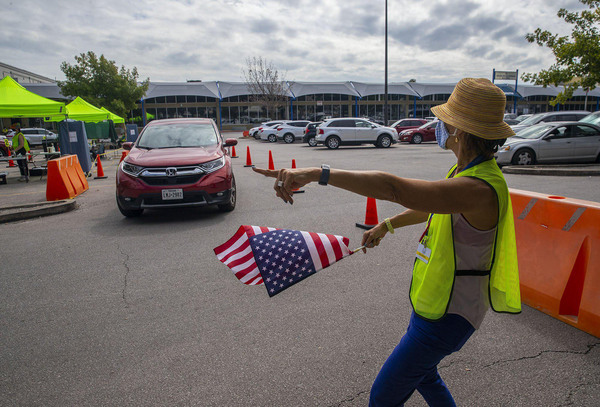 Vehicles form lines and enter the voting area one at a time, where a clerk checks each voter's photo ID, has them sign a roster and hands over a voting machine that is sanitized before the next car pulls up. Voting takes place in large individual tents except at the Toyota Center, home of the NBA's Houston Rockets, where voting takes place in a parking garage.