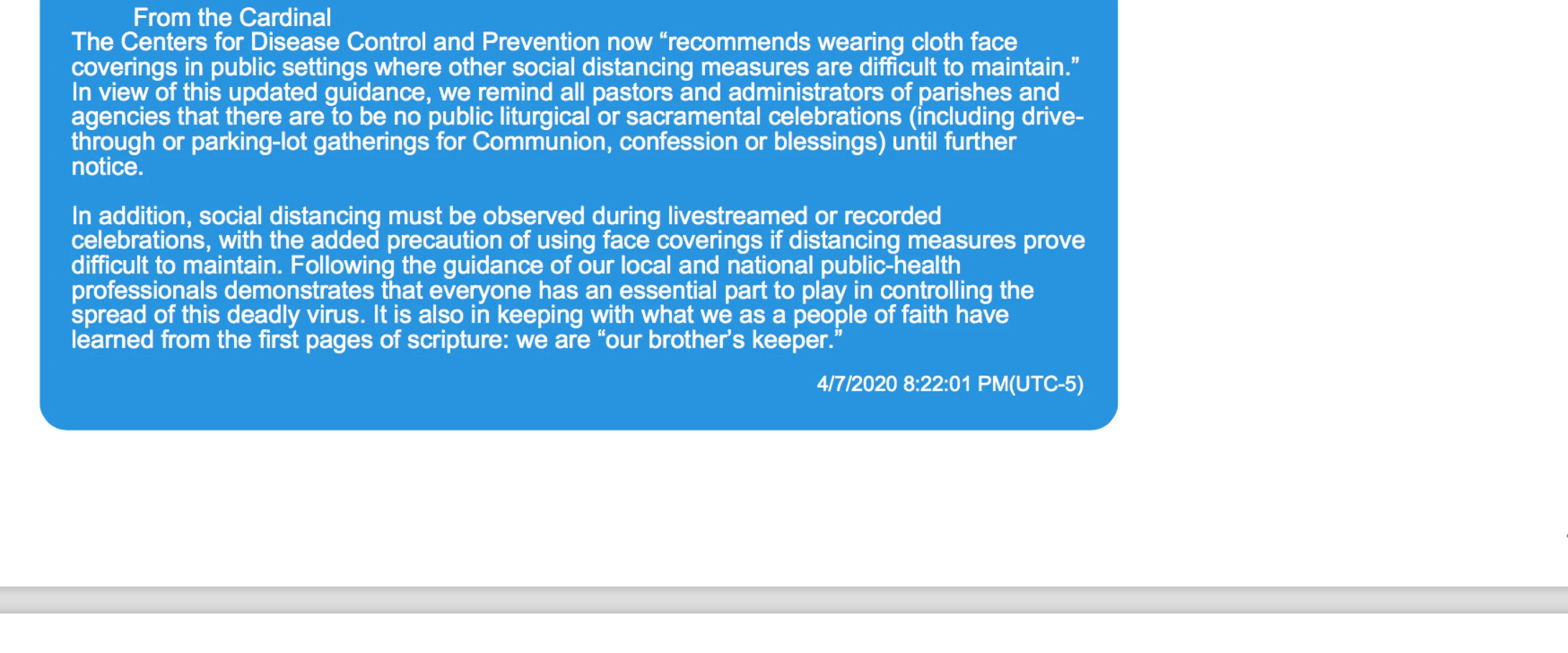 On April 25, 2020, Cupich texted Pritzker: “Thank you for your service to our state. Following your revised stay-at-home order, I have informed our pastors that we will continue to comply as we have from the beginning. I have asked my team, comprised of healthcare professionals and pastors, to suggest some steps that might allow for our parishes to open up gradually.