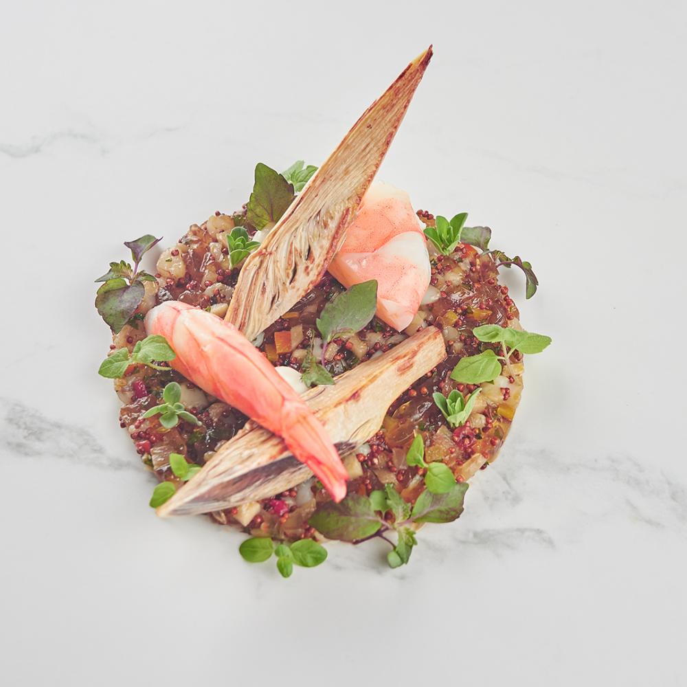 Highlighted dishes include black king fish, baby leek, sweet pepper and wild almond sauce; giant freshwater prawn, banana flowers barigoule-style, heart of palm and shiso seeds; pan-seared ostrich fillet, butternut squash purée, garlic confit and lapsang souchong tea infusion; and glazed farmed pork, buckwheat, carrot, citrus and timut pepper sauce.