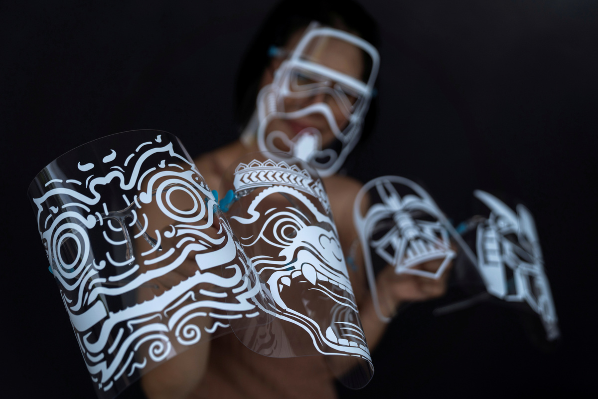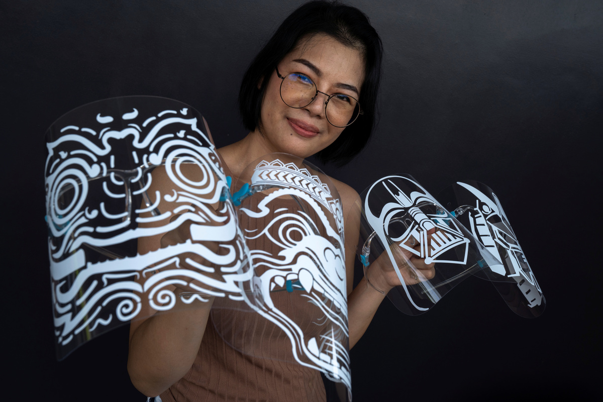 From her small studio room, Maysa Talerd, 31, has been designing patterns and carefully pressing stickers of famous fictional superheroes and villains onto the face shields, aiming to blend safety and style and expand her new business.