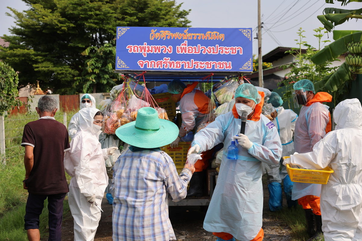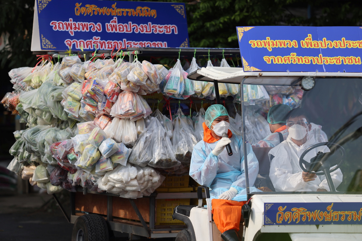 A group of Thai monks and volunteers wearing protective clothing carefully navigate the bumpy roads of a Bangkok suburb in a golf cart, towing a trailer loaded with fresh vegetables.