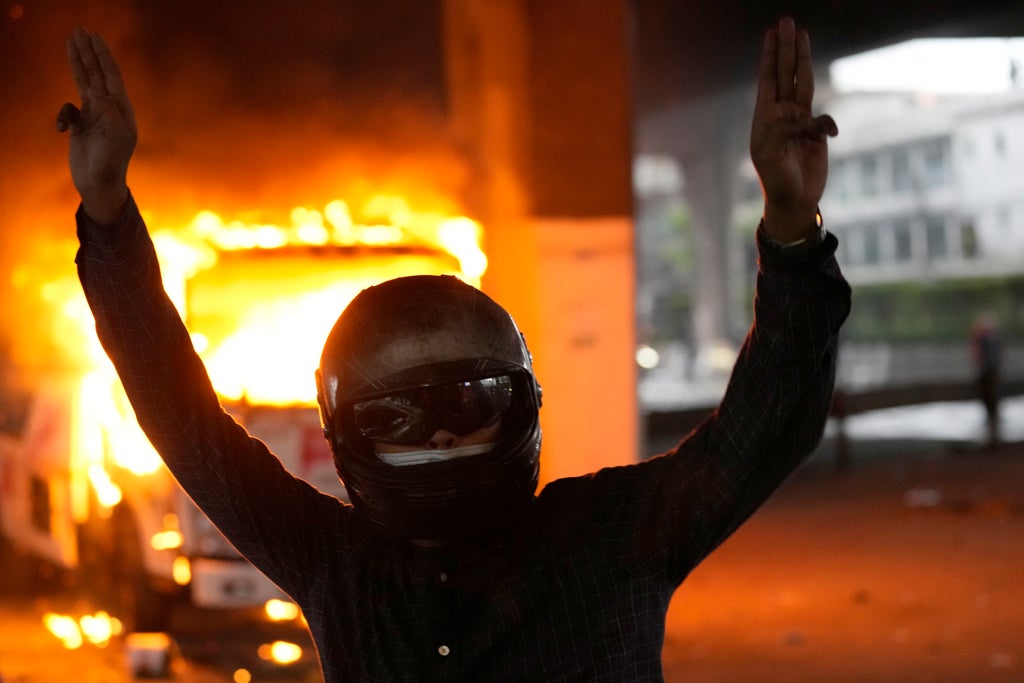 Protesters initially confined themselves mostly to throwing paint at the police but after organizers called off the rally, a group gathered in the nearby Din Daeng area, firing slingshots and hurling firecrackers and small explosive devices called ping-pong bombs. They also set fire to a vehicle that burned fiercely beneath a nearby elevated roadway.