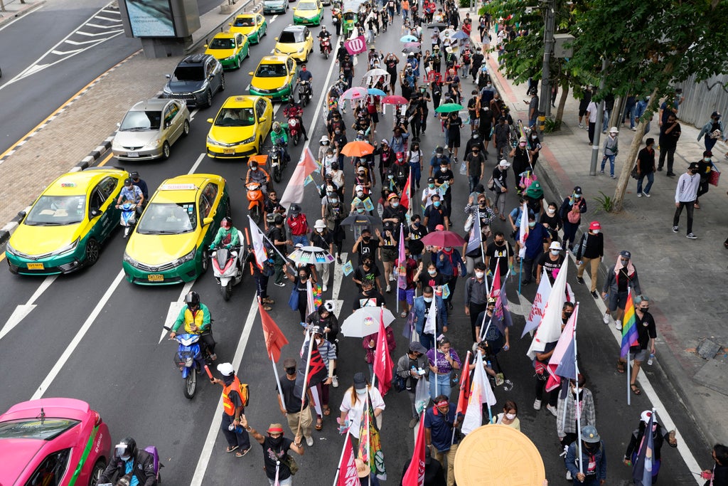 “We come out today to insist on the principle that the constitution must come from the people,” said Jatupat Boonpattararaksa, a protest leader also known as Pai Dao Din.