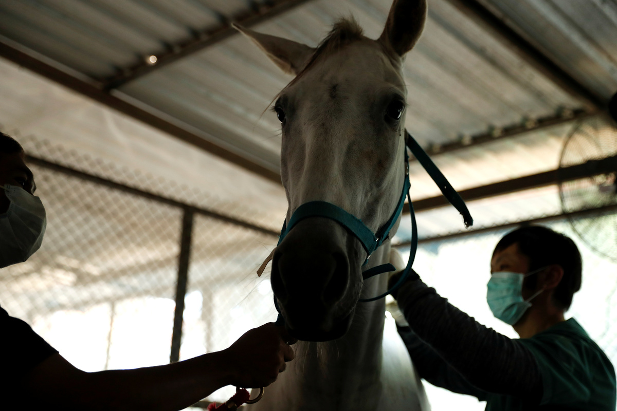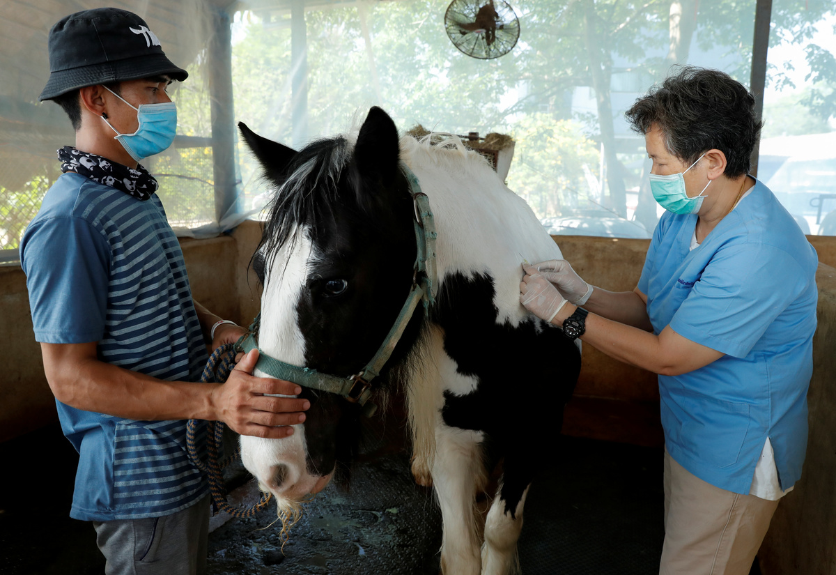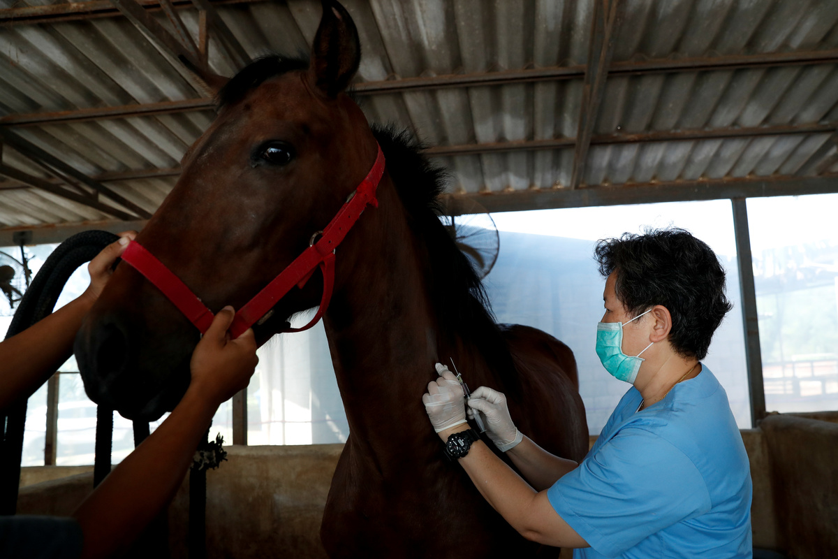 Veterinarian Aree Laikul from Kasetsart University's faculty of Veterinary Medicine, vaccinates a horse amid an outbreak of the deadly African Horse Sickness (AHS) in the country, at Farm Mor Por stable in Khao Yai National Park, Nakhon Ratchasima, Thailand April 20, 2020. REUTERS/Jorge Silva