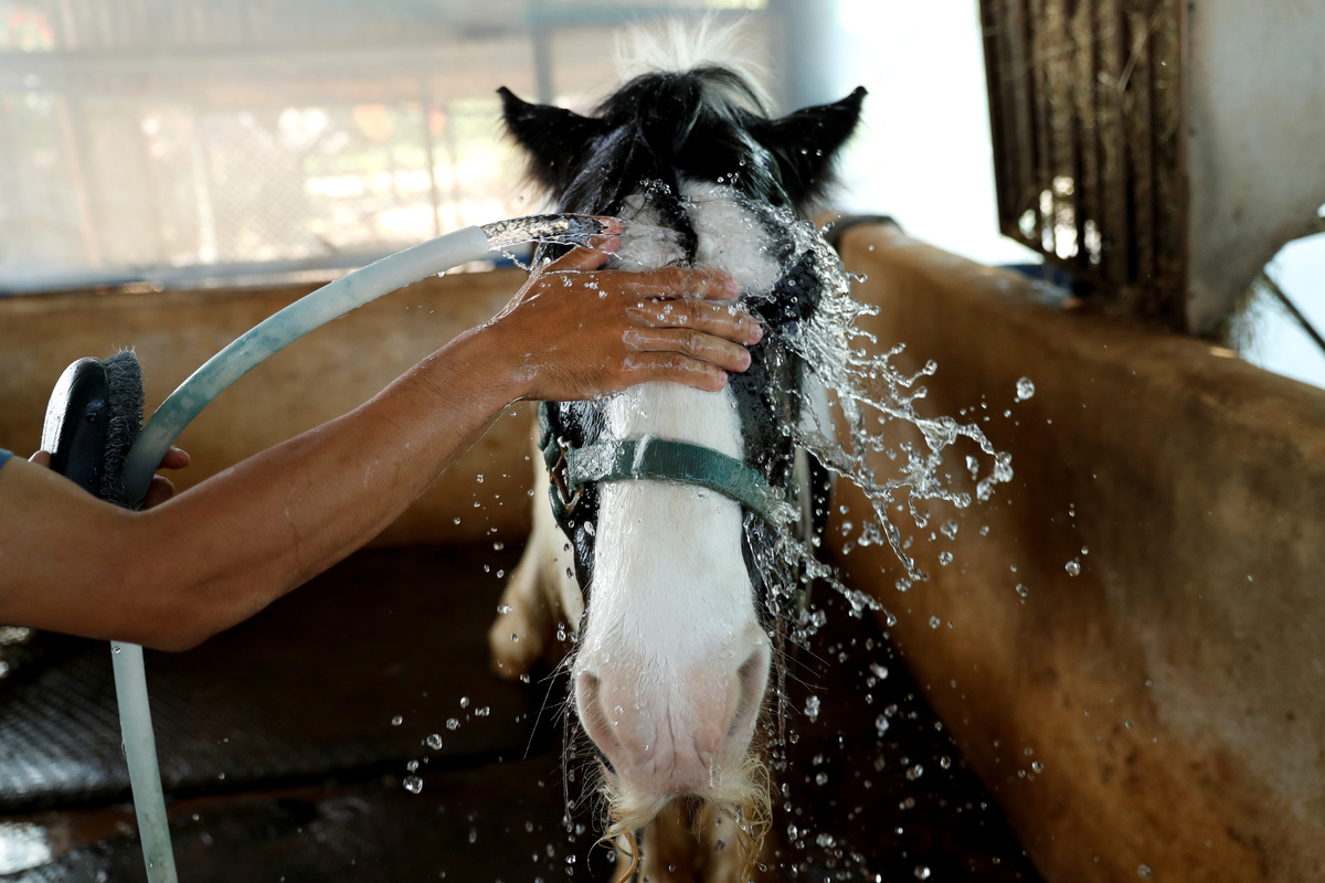 A hostler baths a horse as they wait for vaccination from a veterinarian, amid an outbreak of the deadly African Horse Sickness (AHS) in the country, at Farm Mor Por stable in Khao Yai National Park, Nakhon Ratchasima, Thailand April 20, 2020. REUTERS/Jorge Silva