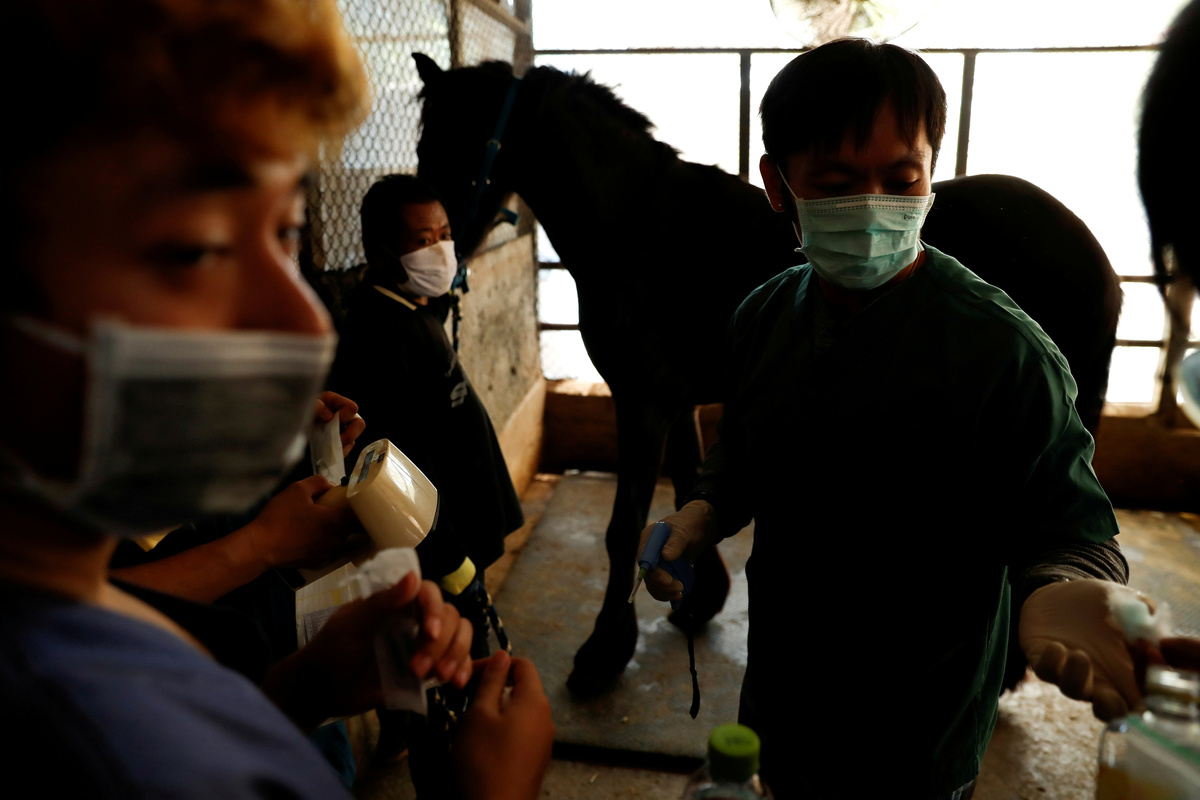Horse vaccines are seen before being injected amid an outbreak of the deadly African Horse Sickness (AHS) in the country, at Farm Mor Por stable in Khao Yai National Park, Nakhon Ratchasima, Thailand April 20, 2020. REUTERS/Jorge SilvaA veterinarian vaccinates a horse, amid an outbreak of the deadly African Horse Sickness (AHS) in the country, at Farm Mor Por stable in Khao Yai National Park, Nakhon Ratchasima, Thailand April 20, 2020. REUTERS/Jorge SilvaVeterinarians stand as they vaccinate horses, amid an outbreak of the deadly African Horse Sickness (AHS) in the country, at Farm Mor Por stable in Khao Yai National Park, Nakhon Ratchasima, Thailand April 20, 2020. REUTERS/Jorge SilvaVeterinarians vaccinate horses, amid an outbreak of the African Horse Sickness (AHS) in the country, which is not transmitted to humans, at Farm Mor Por stable in Khao Yai National Park, parallel to the outbreak of the coronavirus disease (COVID-19), in Nakhon Ratchasima, Thailand April 20, 2020. REUTERS/Jorge Silva