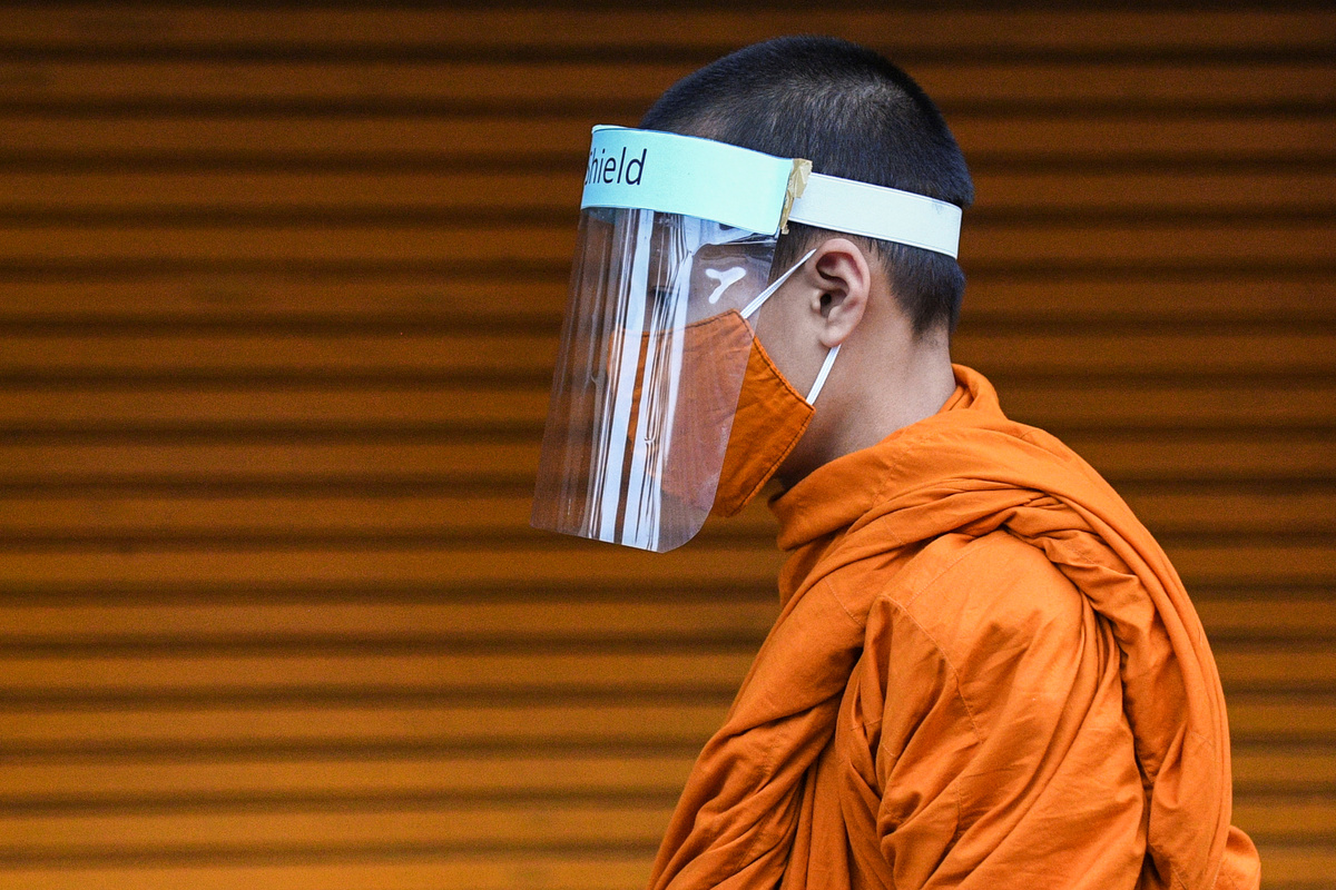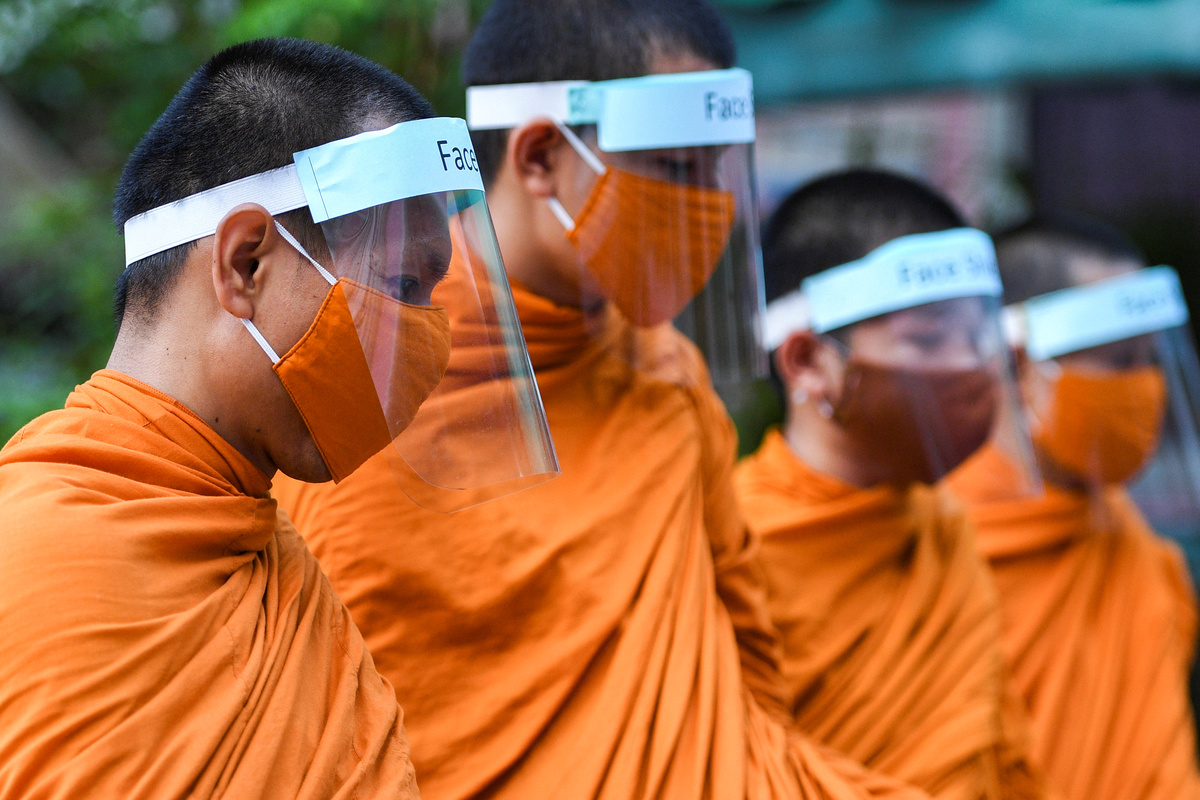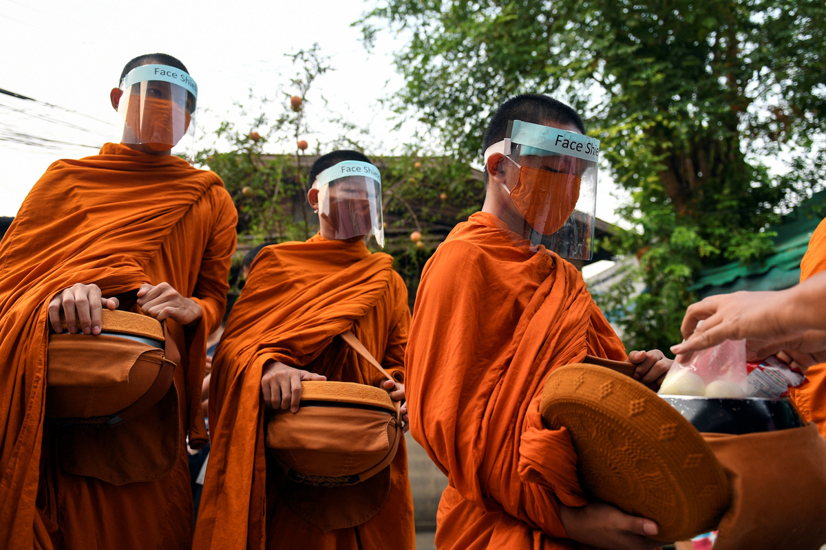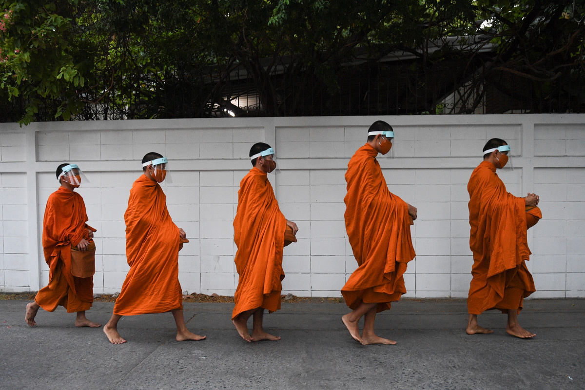 Buddhist monks wearing face shields and mask to protect themselves from the coronavirus disease (COVID-19) collect alms in Bangkok, Thailand, March 31, 2020. REUTERS/Chalinee Thirasupa
