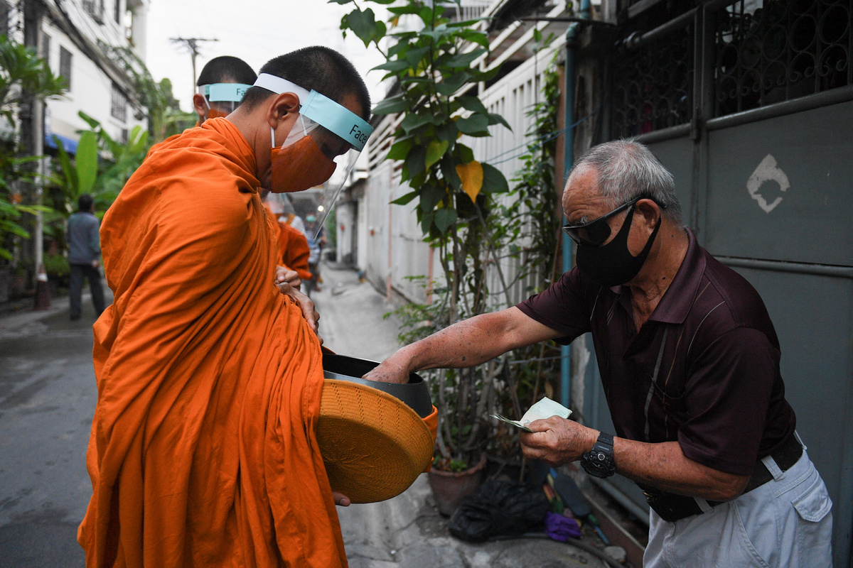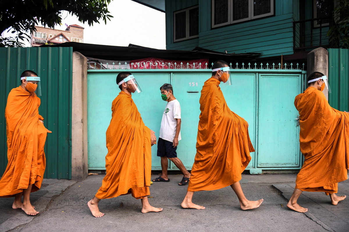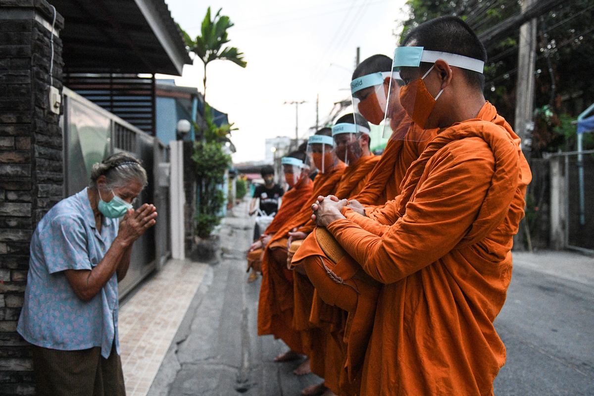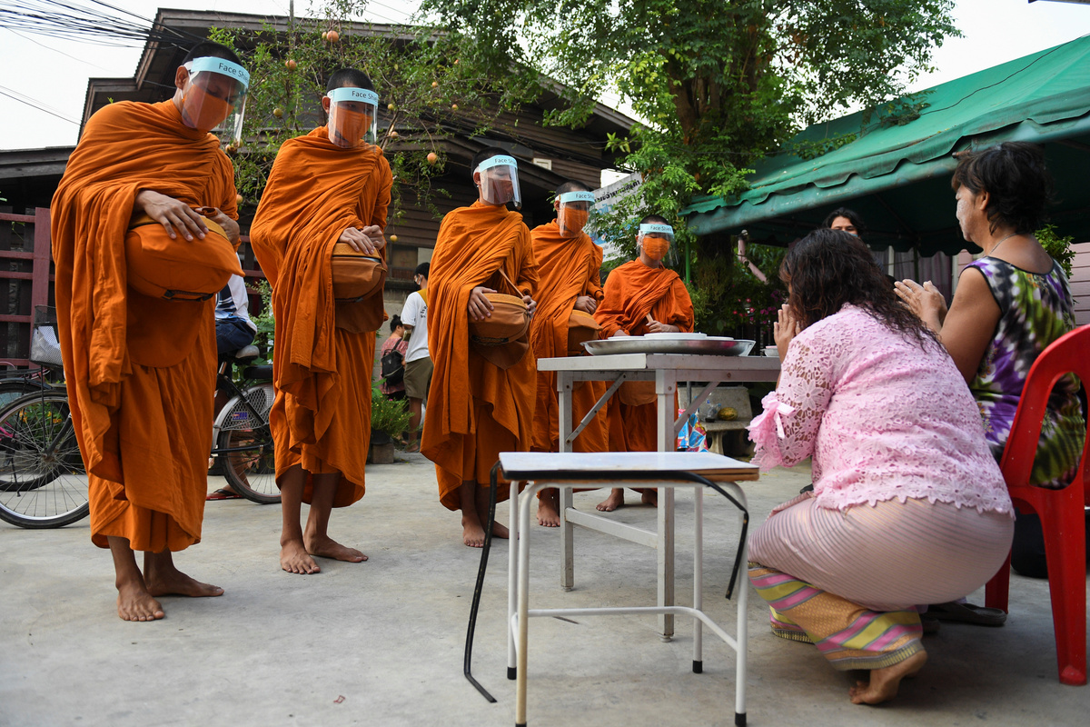 Buddhist monks wearing face shields and mask to protect themselves from the coronavirus disease (COVID-19) collect alms in Bangkok, Thailand, March 31, 2020. REUTERS/Chalinee Thirasupa