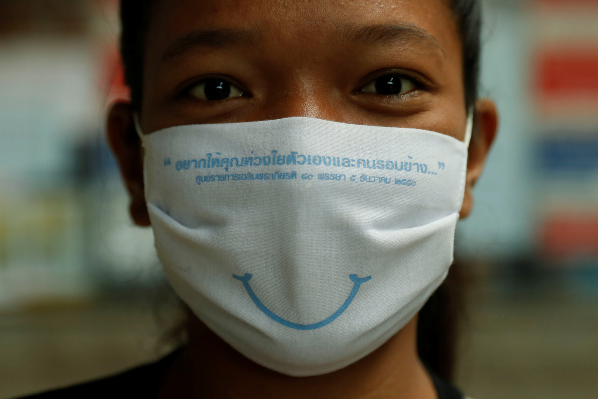 A passenger wearing a protective face mask reading "I wish you care about yourself and family" poses for a portrait at Hua Lamphong train station in Songkran holiday which marks the Thai New Year during the coronavirus disease (COVID-19) outbreak, in Bangkok, Thailand, April 14, 2020. REUTERS/Jorge Silva
