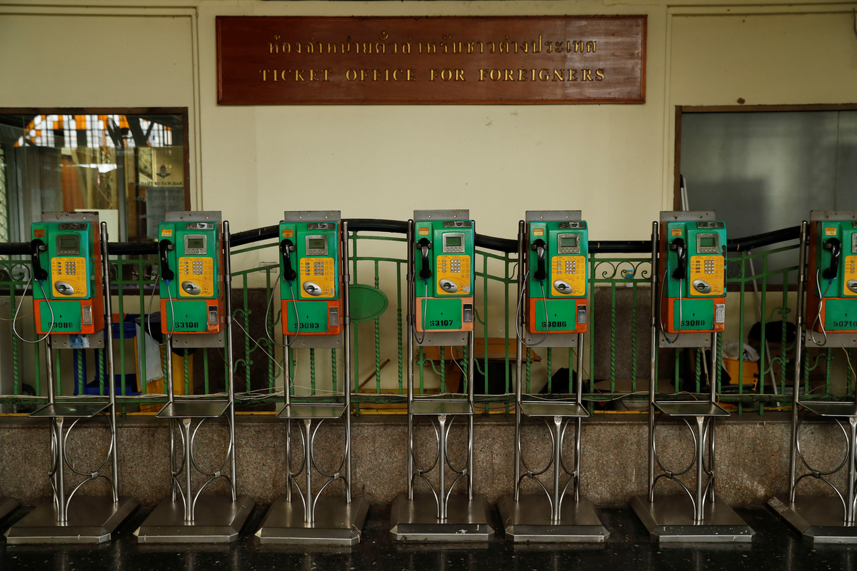 Empty seats are seen at Mo Chit bus terminal during the Songkran holiday which marks the Thai New Year, during the coronavirus disease (COVID-19) outbreak, in Bangkok, Thailand, April 14, 2020. REUTERS/Soe Zeya TunPublic telephones are seen at an empty Hua Lamphong train station in Songkran holiday which marks the Thai New Year during the coronavirus disease (COVID-19) outbreak, in Bangkok, Thailand, April 14, 2020. REUTERS/Jorge SilvaA woman wearing a protective face mask cleans a train's window at an empty Hua Lamphong train station in Songkran holiday which marks the Thai New Year during the coronavirus disease (COVID-19) outbreak, in Bangkok, Thailand, April 14, 2020. REUTERS/Jorge SilvaA woman wearing a protective face mask looks at her phone at an empty Mo Chit bus terminal during the Songkran holiday which marks the Thai New Year, during the coronavirus disease (COVID-19) outbreak, in Bangkok, Thailand, April 14, 2020. REUTERS/Soe Zeya TunA woman wearing a protective face mask walks at an empty Hua Lamphong train station in Songkran holiday which marks the Thai New Year during the coronavirus disease (COVID-19) outbreak, in Bangkok, Thailand, April 14, 2020. REUTERS/Jorge Silva