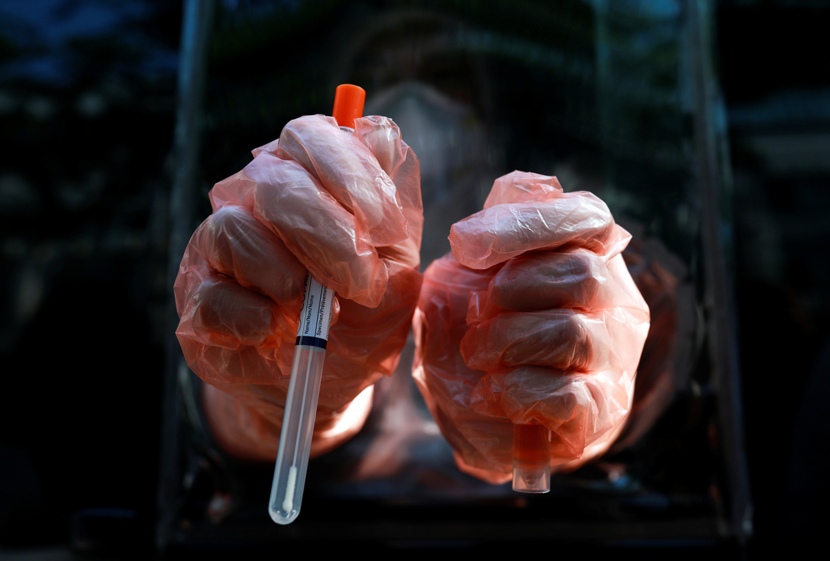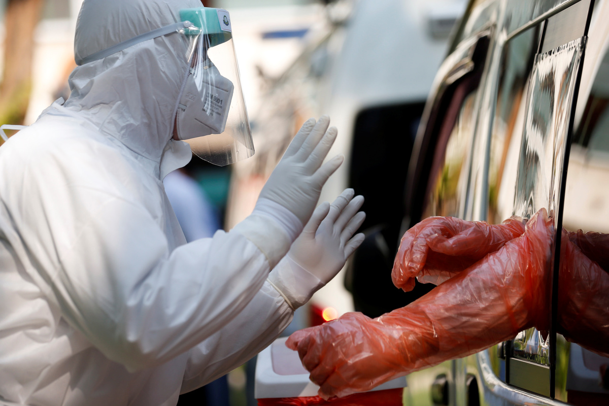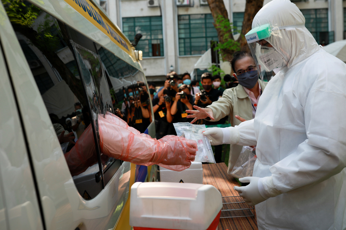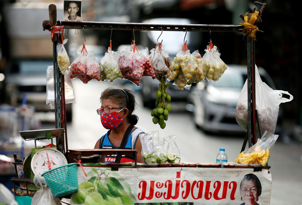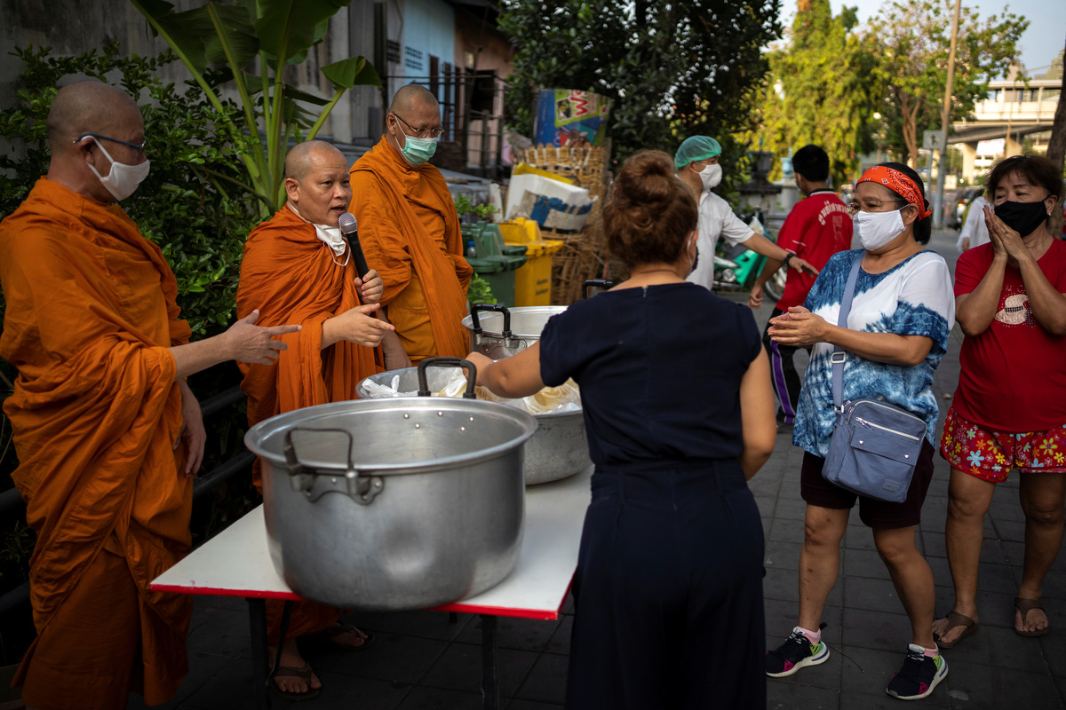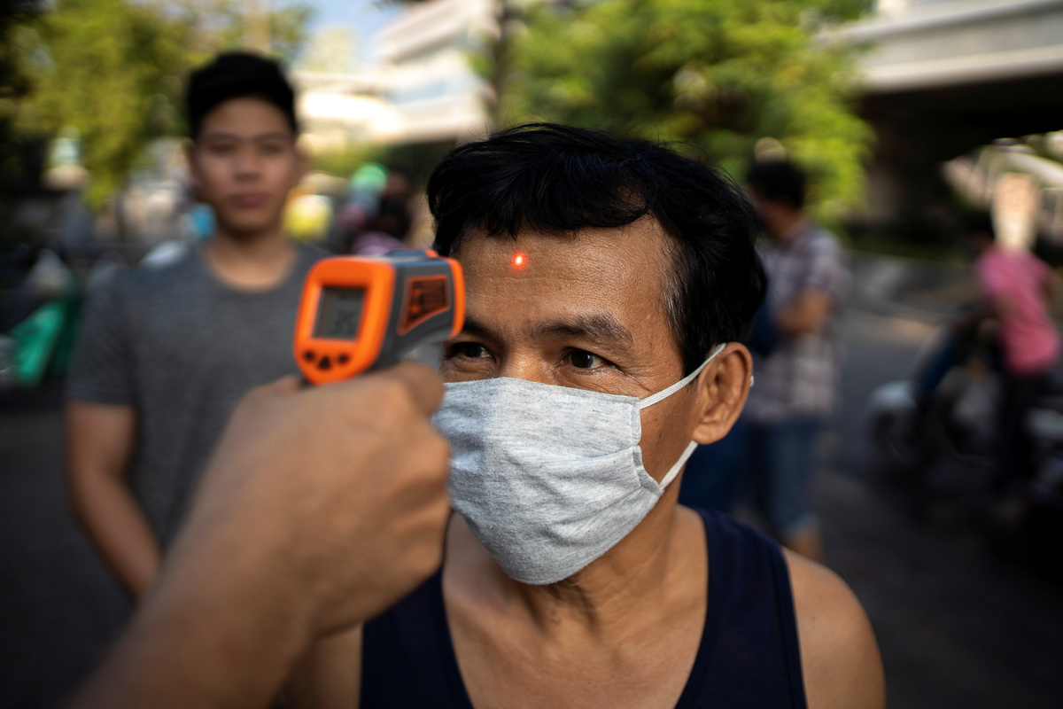 A medic wearing protective gloves shows a test kit as he works at a mobile laboratory for coronavirus disease (COVID-19) testing in Bangkok, Thailand, April 9, 2020. REUTERS/Soe Zeya Tun Medics wearing protective suits work at a mobile laboratory for coronavirus disease (COVID-19) testing in Bangkok, Thailand, April 9, 2020. REUTERS/Soe Zeya TunMedics wearing protective suits work at a mobile laboratory for coronavirus disease (COVID-19) testing in Bangkok, Thailand, April 9, 2020. REUTERS/Soe Zeya TunMen wearing protective face masks are seen inside a community during the coronavirus disease (COVID-19) outbreak in Bangkok, Thailand, April 9, 2020. REUTERS/Athit PerawongmethaA vendor wearing a protective face mask sells mangoes in a market during the coronavirus disease (COVID-19) outbreak in Bangkok, Thailand April 8, 2020. REUTERS/Soe Zeya TunA man wearing a face mask has his body temperature checked due to the spread of the coronavirus disease (COVID-19) before receiving a free meal distributed by Wat Pho Nimit temple in Bangkok, Thailand, April 8, 2020. REUTERS/Athit PerawongmethaBuddhist monks from Wat Pho Nimit temple distribute free meal to people during the spread of the coronavirus disease (COVID-19) in Bangkok, Thailand, April 8, 2020. REUTERS/Athit Perawongmetha