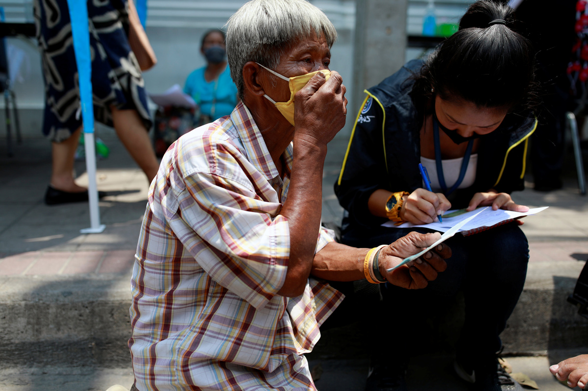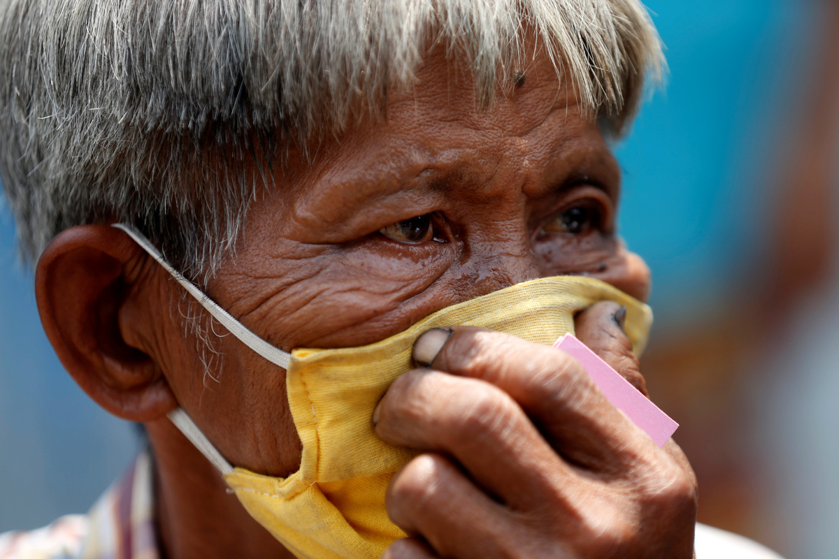 An old man affected by the government's measures against the spread of the coronavirus disease (COVID-19) cries as he receives help from a volunteer in order to file forms for three months of monthly financial aid from the government in front of the Finance Ministry in Bangkok, Thailand, May 1, 2020. REUTERS/Soe Zeya Tun