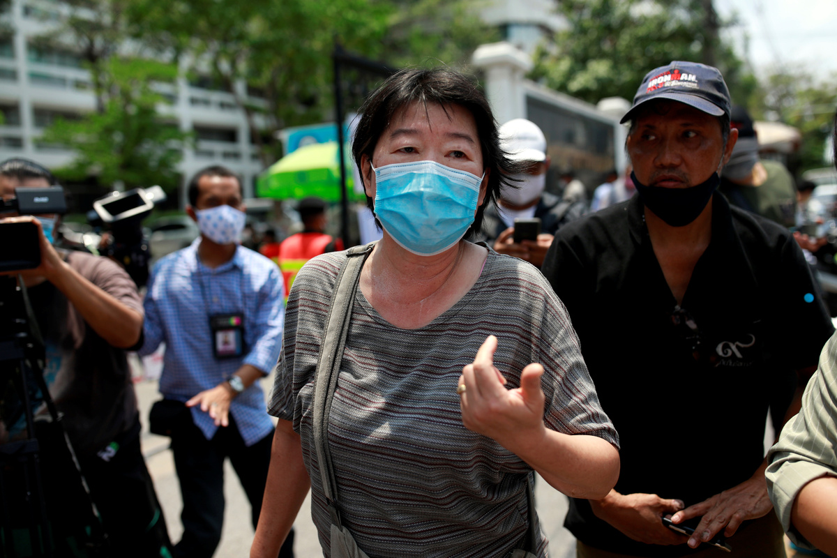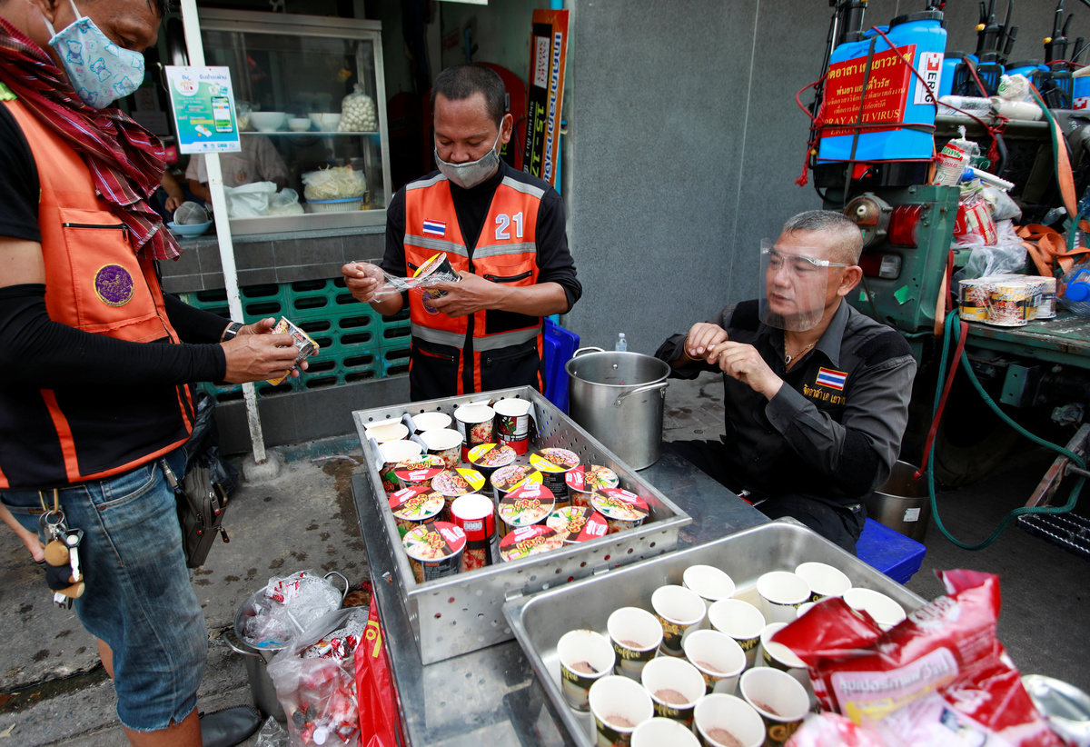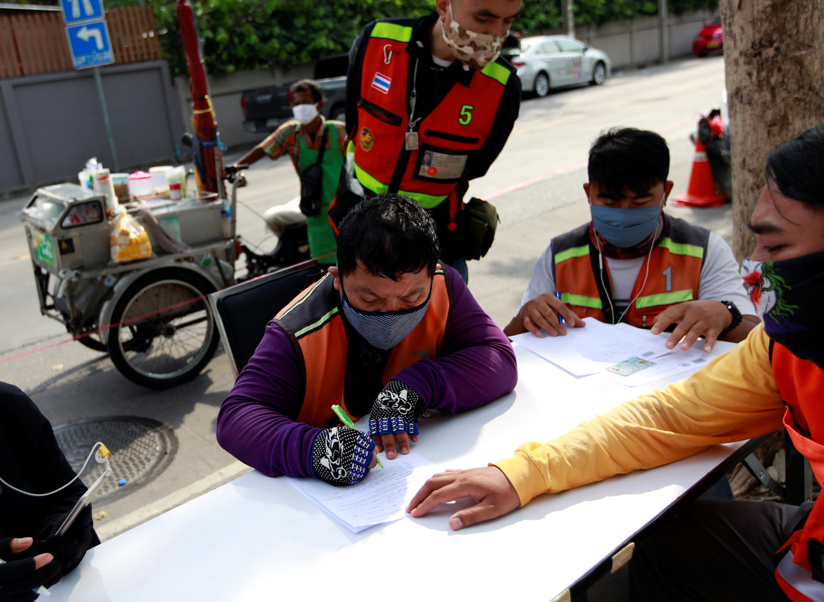 FILE PHOTO: A woman wearing a protective mask lines up outside a liquour shop after Bangkok and several other provinces announced a 10-day ban on alcohol sale starting April 10 during the coronavirus disease (COVID-19) outbreak in Bangkok, Thailand, April 9, 2020. REUTERS/Jorge Silva/File PhotoA woman affected by the government's measures against the spread of the coronavirus disease (COVID-19), wearing a protective face mask, complaints to the officers as she lines up for filing forms to request three months of monthly financial aid from the government in front of the Finance Ministry in Bangkok, Thailand, May 1, 2020. REUTERS/Soe Zeya TunMotorbike drivers who have been affected by the government's measures against the spread of the coronavirus disease (COVID-19) get free food as they request for three months of monthly financial aid from the government in front of the Finance Ministry in Bangkok, Thailand, May 1, 2020. REUTERS/Soe Zeya TunFILE PHOTO: Staff, wearing protective masks, work at a market during the coronavirus disease (COVID-19) outbreak in Bangkok, Thailand April 29, 2020. REUTERS/Soe Zeya Tun
