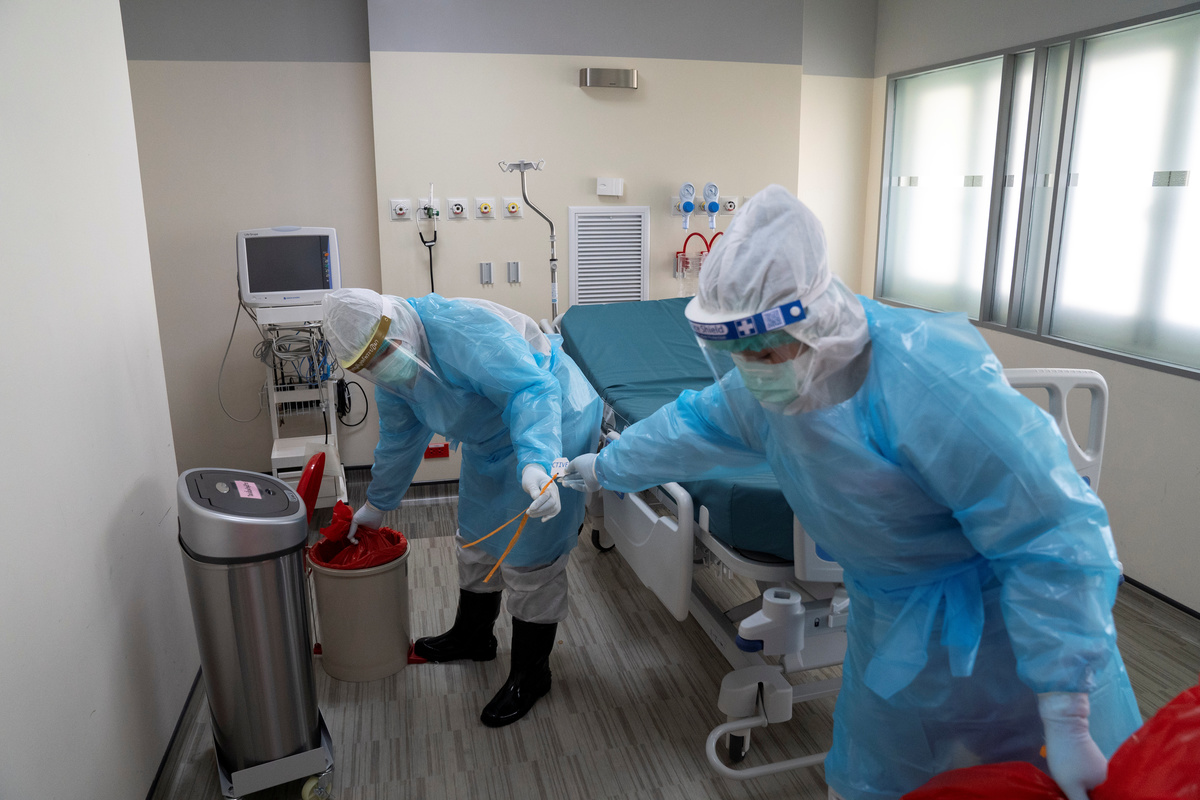 Housekeepers wearing personal protective equipment (PPE) clean a COVID-19 patient's room after they are discharged from the Emerging Infectious Disease Clinic intensive care unit (ICU) at King Chulalongkorn Memorial Hospital in Bangkok, Thailand, April 20, 2020. REUTERS/Athit Perawongmetha