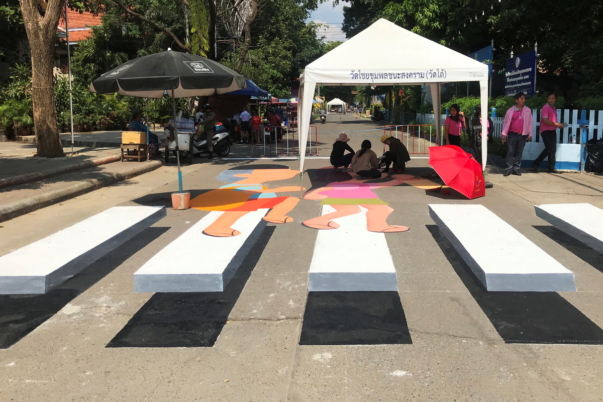 The zebra crossing outside the main entrance to Wat Bueng Thong Lang school on the outskirts of Bangkok, was painted by students and volunteers, with funding from Thailand's Government Savings Bank. During the past few months they have painted six near schools and temples, where there is always a heavy footfall, Natthapong Jiravijit, the project manager said.