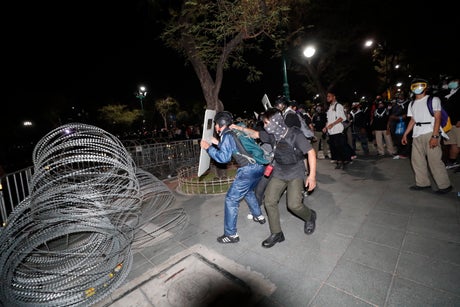 Police deputy spokesperson Krissana Pattanacharoen said more than 20 police were injured and seven or eight protesters detained. There was no information on the number of protesters hurt when they tried to breach heavily defended police lines.