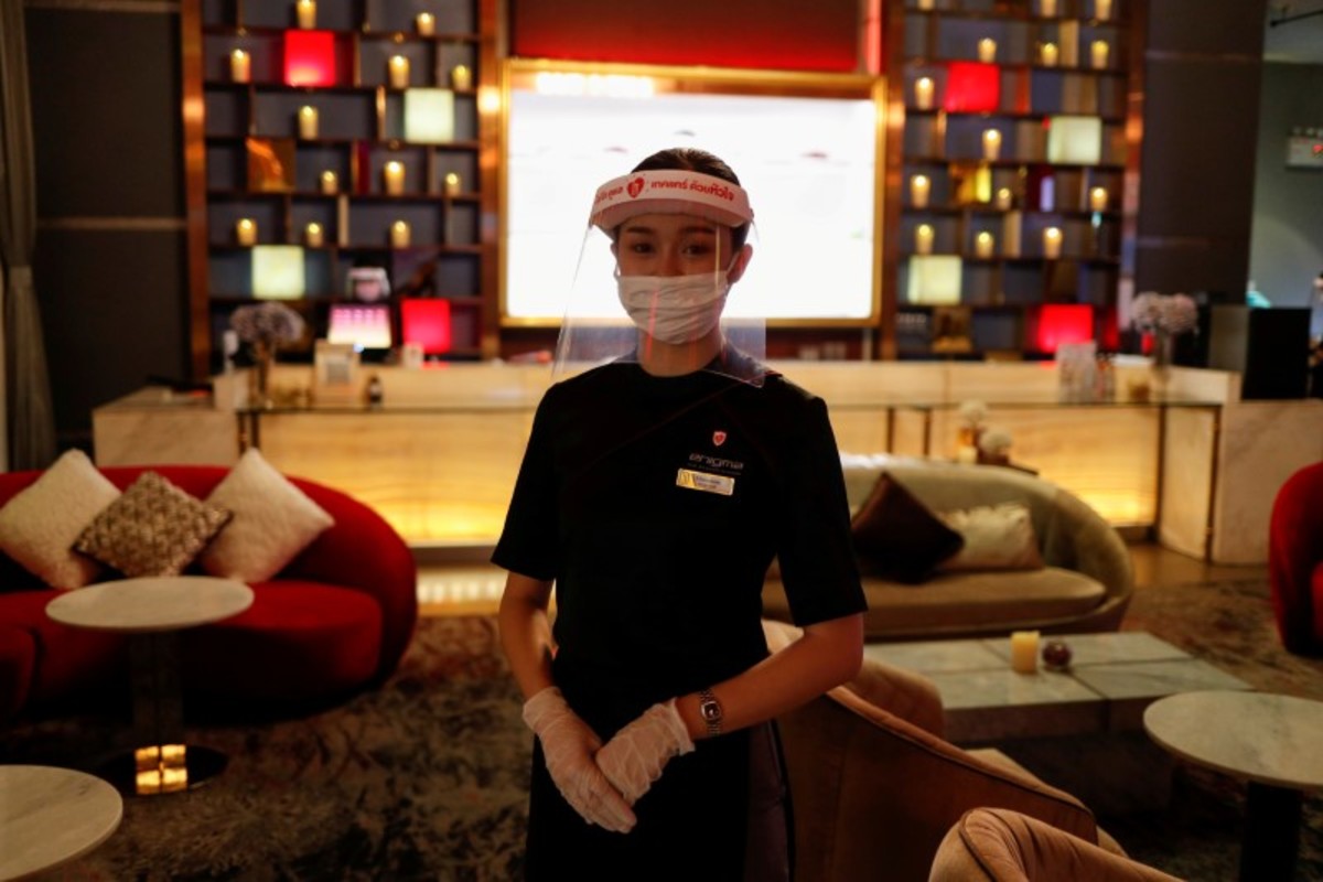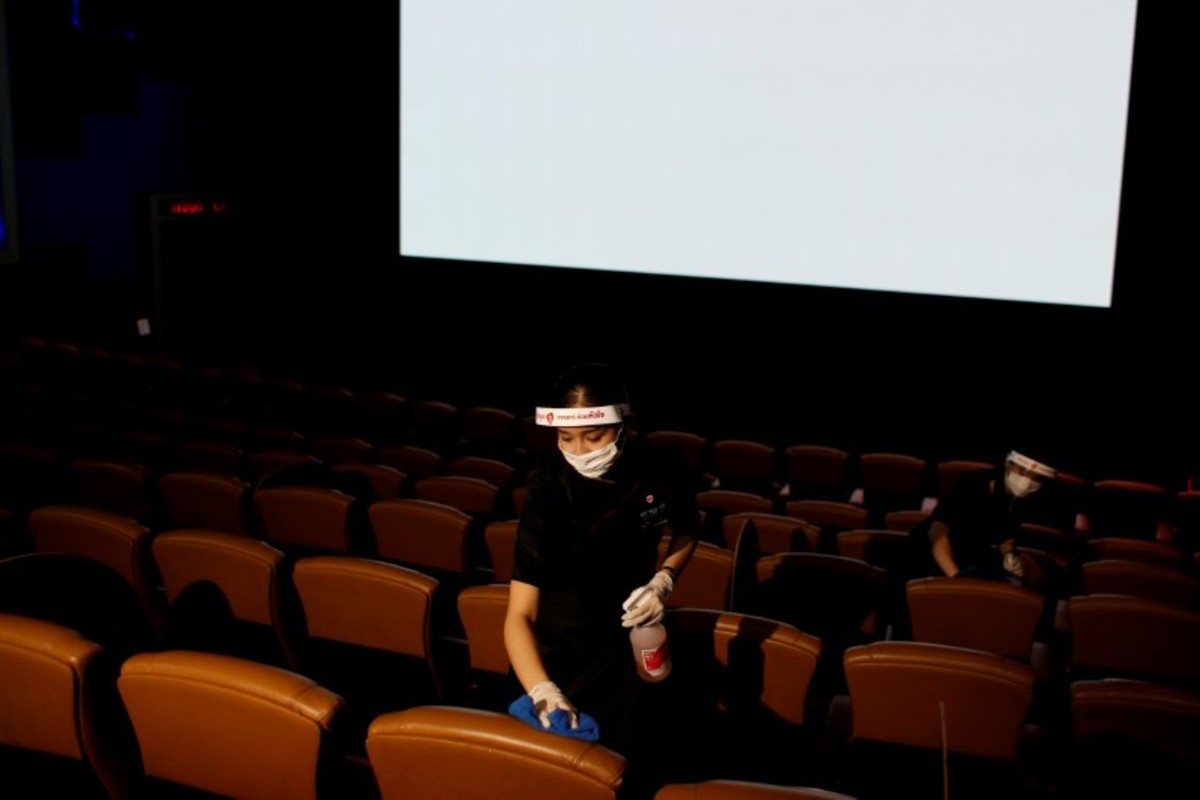 Workers wearing protective face masks and protective face shields disinfect inside a movie theater ahead of its reopening after the Thai government eased isolation measures to prevent the spread of the coronavirus disease (COVID-19) in Bangkok, Thailand, June 1, 2020. REUTERS/Jorge SilvaA worker wearing a protective suit sprays disinfectant inside a movie theater ahead of its reopening after the Thai government eased isolation measures to prevent the spread of the coronavirus disease (COVID-19) in Bangkok, Thailand, June 1, 2020. REUTERS/Jorge SilvaWorkers wearing protective suits spray disinfectant inside a movie theater ahead of its reopening after the Thai government eased isolation measures to prevent the spread of the coronavirus disease (COVID-19) in Bangkok, Thailand, June 1, 2020. REUTERS/Jorge SilvaEmpty seats are seen at a movie theater ahead of its reopening after the Thai government eased isolation measures to prevent the spread of the coronavirus disease (COVID-19) in Bangkok, Thailand, June 1, 2020. REUTERS/Jorge SilvaPeople wearing protective face masks are seen inside a movie theater during its reopening after the Thai government eased isolation measures to prevent the spread of the coronavirus disease (COVID-19) in Bangkok, Thailand, June 1, 2020. REUTERS/Jorge SilvaPeople are seen inside a movie theater during its reopening after the Thai government eased isolation measures to prevent the spread of the coronavirus disease (COVID-19) in Bangkok, Thailand, June 1, 2020. REUTERS/Jorge SilvaA therapist wearing a face shield does traditional Thai massage to a customer in a Health Land brach massage house which reopened after the Thai government eased isolation measures to prevent the spread of the coronavirus disease (COVID-19) in Bangkok, Thailand, June 1, 2020. REUTERS/Jorge SilvaTwo customers are separated by a plastic screen as they sit together at a table in a shopping center, after the Thai government eased isolation measures, amid the coronavirus disease (COVID-19) outbreak, in Bangkok, Thailand, June 1, 2020. REUTERS/Jorge Silva