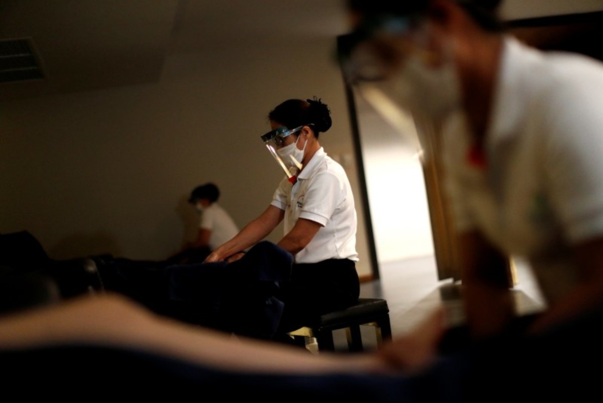 Thai masseuses wearing plastic face shields and masks rubbed the toes of contented customers, who relaxed in reclining chairs with large spaces in between. Plastic floor mattresses were disinfected regularly, ready for the next customer.