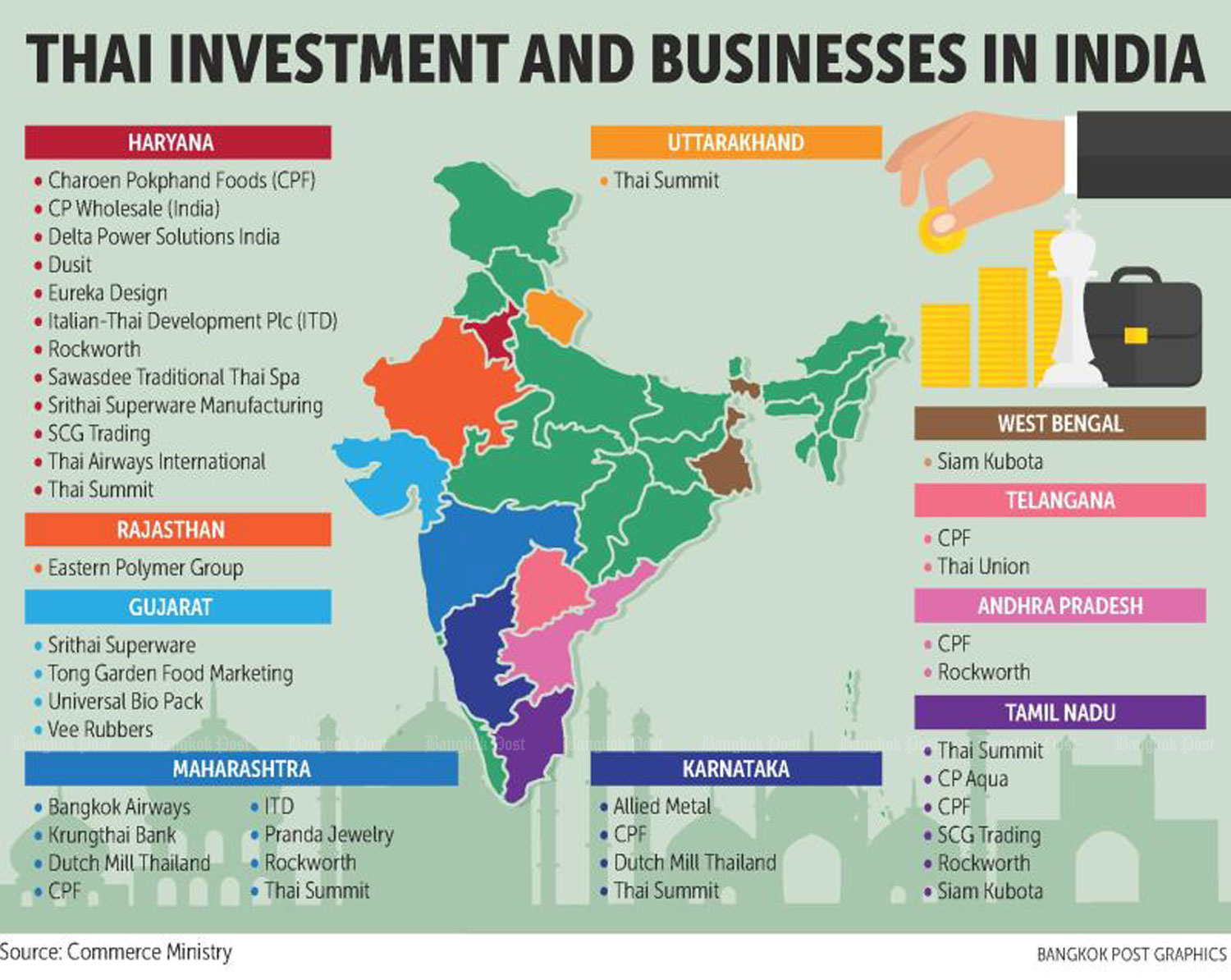 "Thai investors do not rely on India as a production base for exports," he said. "Thai investors mostly focus on the Indian market for sales, such as food, garments and footwear, or in the case of SCG, for packaging, and Italthai, for construction."