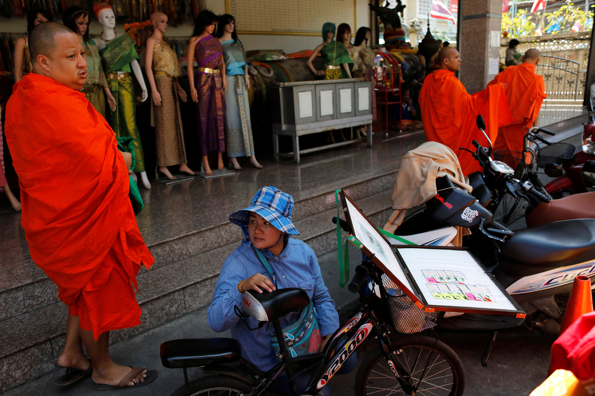 Buddhist monks walk past a lottery seller outside the Wat Kunnatri Ruttharam temple in Bangkok, Thailand November 1, 2018. Picture taken November 1, 2018. REUTERS/Jorge Silva
