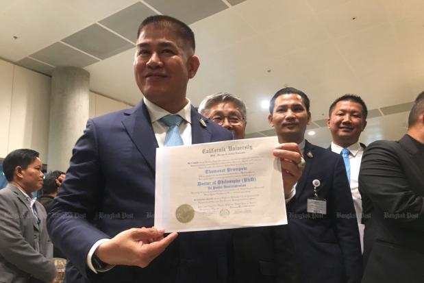 Deputy Agriculture and Cooperatives Minister Thamanat Prompow has shown what he claimed was proof after fresh allegations his PhD might be fake.