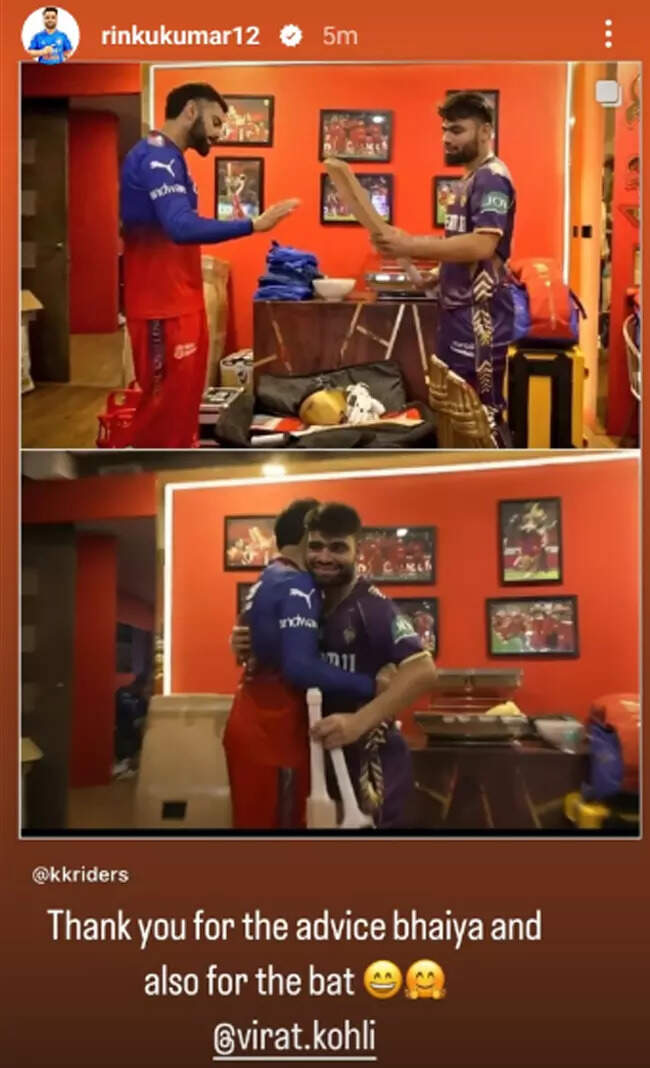 Expressing gratitude for the thoughtful gift, Rinku Singh took to Instagram to thank Virat Kohli for both the bat and the advice.
